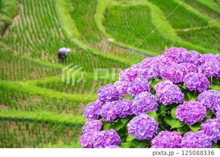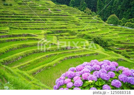 アジサイ咲く田植えシーズンの丸山千枚田(三重県熊野市)