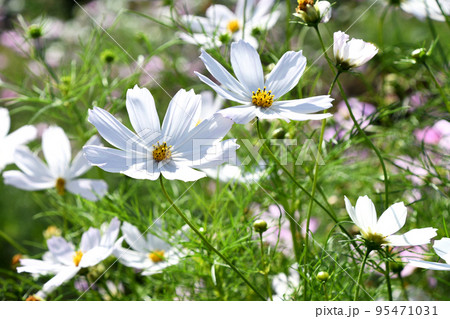 秋晴れの日差しの中で咲く純白のコスモス