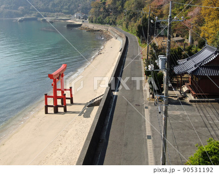 屋代島の小積の浜の厳島神社の鳥居の空撮