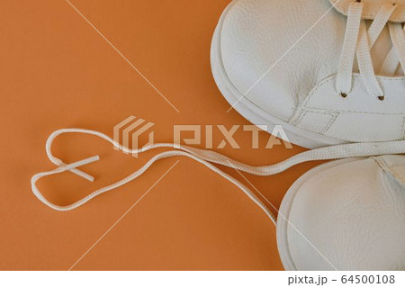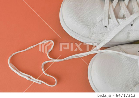 Pair of white shoes with heart made of shoelaces on orange background. Trendy summer color. Trendy summer bold color image .