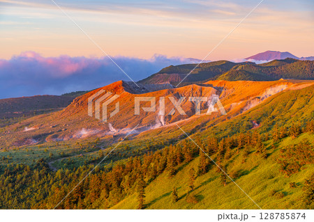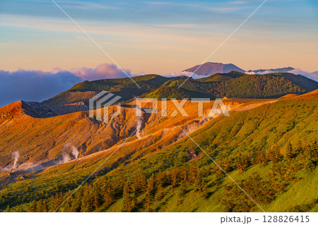 (群馬県)渋峠から望む、朝の光を浴びる芳ヶ平と噴煙上げる白根山