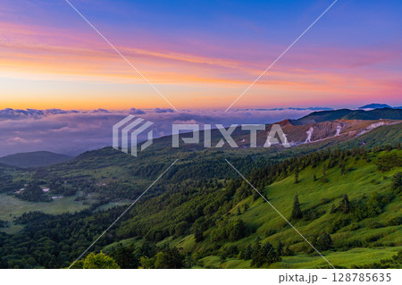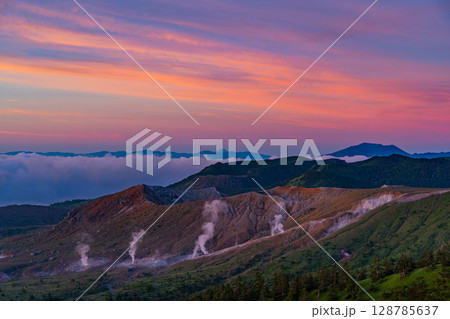 (群馬県)夜明けの渋峠から望む、噴煙上げる白根山