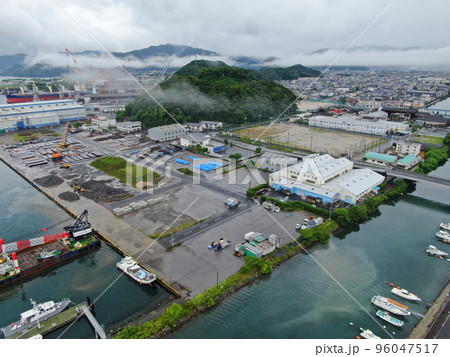 雨上がりの雲に覆われた大分県佐伯市の港湾の空撮