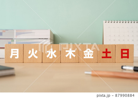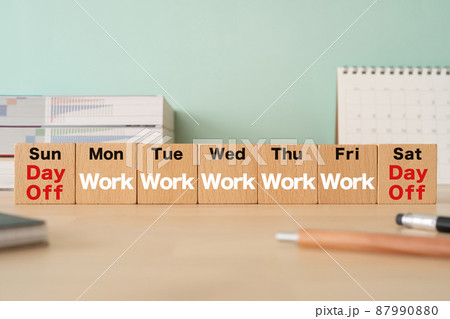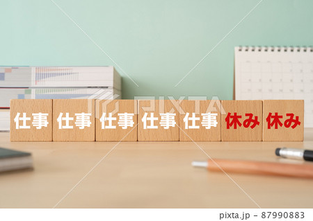 週休2日のイメージ|積み木や本が置かれたオフィスのデスク
