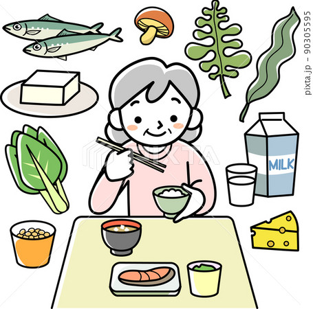 食事をするシニア女性と食品