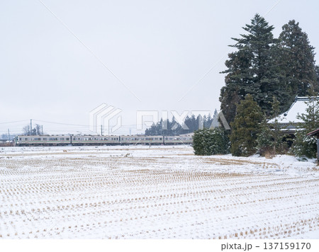 【山形線】冬の田園風景を走行する普通列車