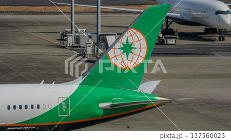 エバー航空の機体ロゴと緑色の垂直尾翼
