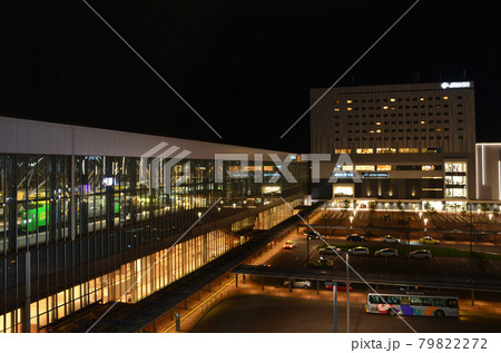 夜の旭川駅に到着した特急「ライラック」と北口広場
