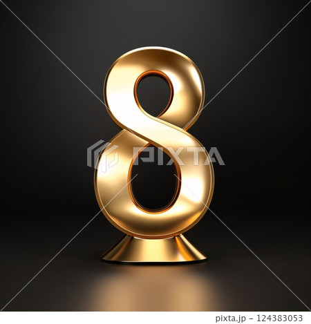 Golden number 8 isolated on black background. 3d rendered font.