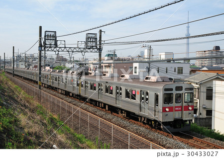 スカイツリーを望む東京の下町を走る東急8500系電車
