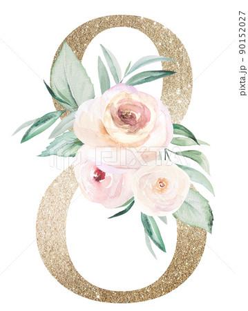 Light golden number 8 with watercolor roses and leaves. Pastel floral alphabet