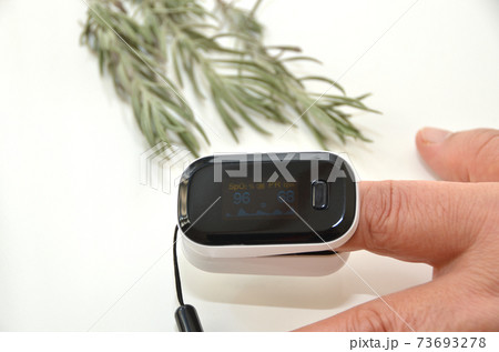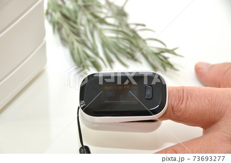 老人のゆびを入れたパルスオキシメーター・96%表示