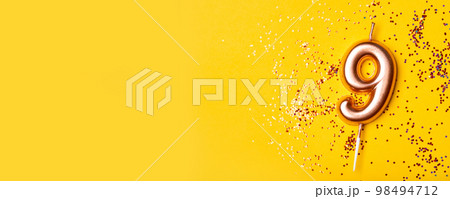 Gold candle in the form of number nine on yellow background with confetti.