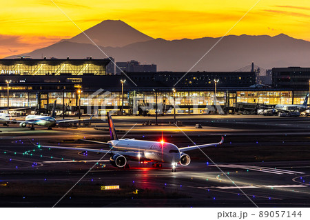 富士山を背景に誘導路を走るジェット機 旅客機 羽田空港から見る富士山