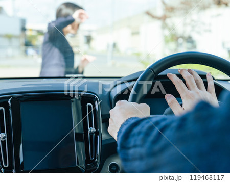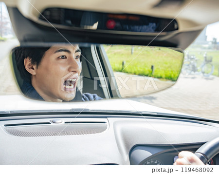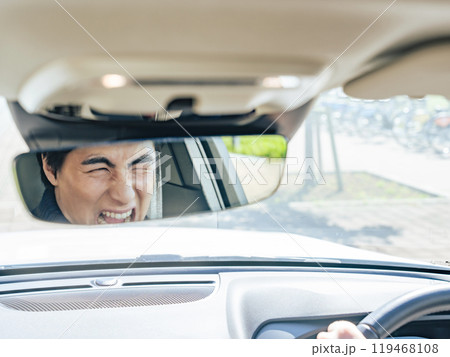 事故を起こしそうな男性ドライバーのルームミラー越しの表情