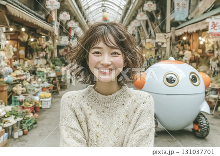 美優シリーズ:自動デリバリーロボットの試験シーン、美優が笑顔で商店街を歩きながらロボットを見守る