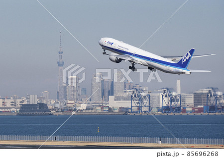 東京スカイツリーと高層ビル群を背景に離陸する航空機 羽田空港 東京都大田区