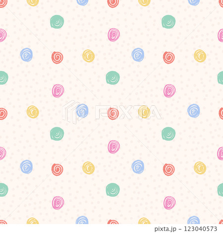 Polka dots multi colors seamless pattern. Crayon kids endless background. Naive simple dot ornament repeat cover. Round green, red and yellow continuous ornament. Vector hand drawn illustration