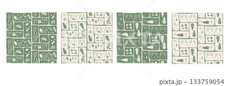 Green tennis seamless pattern collection with rackets, balls, flowers and bow. Sport-themed patchwork repeating print backgrounds. Bento box textile design with vintage accent. Vector coquette aop bg