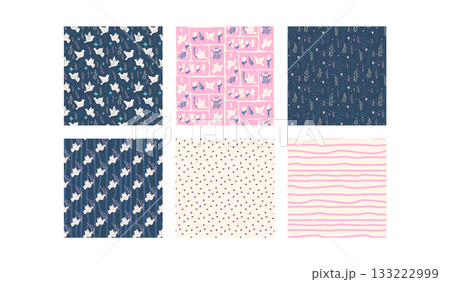 Birds seamless patterns collection. Folk dove of peace motif blu, pink and beige background set. Pigeons flying, stripes repeat background. Vector hand drawn flat doves print illustrations