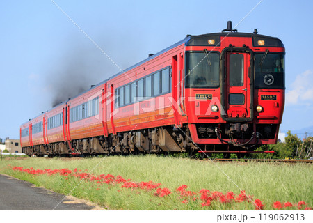 彼岸花咲く久大本線を行く特急「ゆふ」(JR九州)