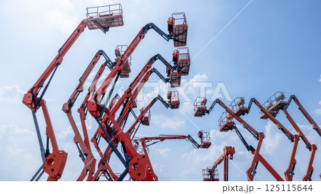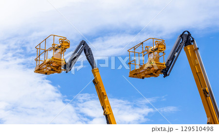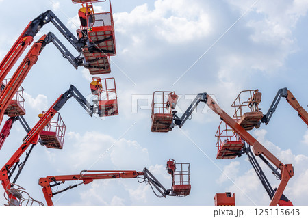 Articulate boom lift with blue sky background, Aerial platform lift telescopic boom lift hydraulic boom lift, Mobile construction crane, Construction boom lifts