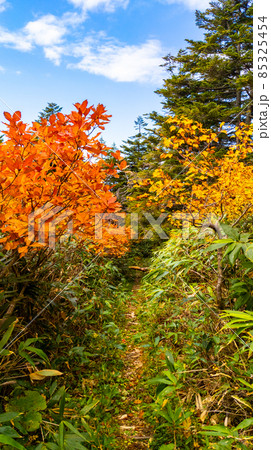 紅葉に囲まれた細い山道 (山形県、蔵王連峰)