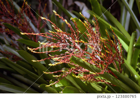 太陽自然光に紅色葉観葉植物のエクメア(マクロレンズ使用・自然光・接写写真)