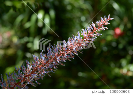 Aechmea Blue Tango exotic flowers grow in botanical garden. Blue Tango Urn Plant Bromeliad. Silver Vase Plant in bloom
