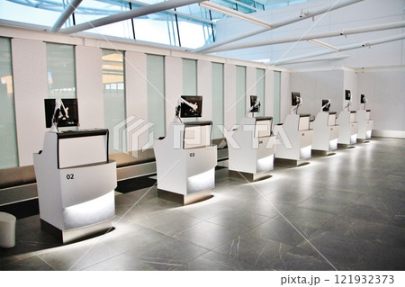 手荷物タグ発行機の並んだチェックインカウンター