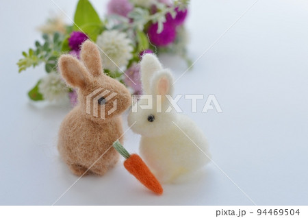 羊毛フェルトの白いウサギと千日紅のブーケ