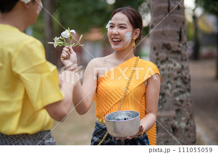 A beautiful Young Thai couple wearing Thai costumes playing in the water during Songkran in the temple