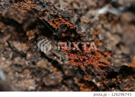 朽木表面にモジホコリ科と思われる赤茶(赤さび色)の変形菌(粘菌)群体(自然環境下ストロボマクロ撮影)