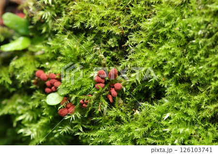 青々とした苔の間から赤茶色のウツボホコリ属の姿(自然環境下ストロボマクロ撮影)