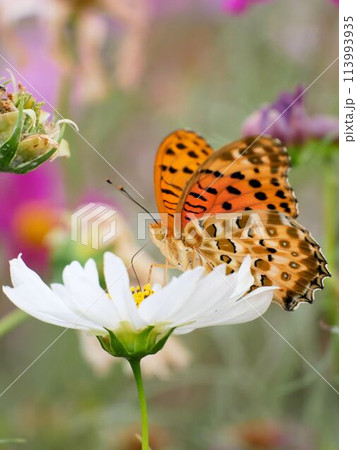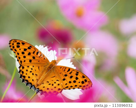 ピンクのコスモスとツマグロヒョウモン (Argyreus hyperbius )