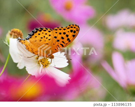 オレンジ色の蝶のツマグロヒョウモン(褄黒豹紋)がコスモスの花の蜜を吸っています。