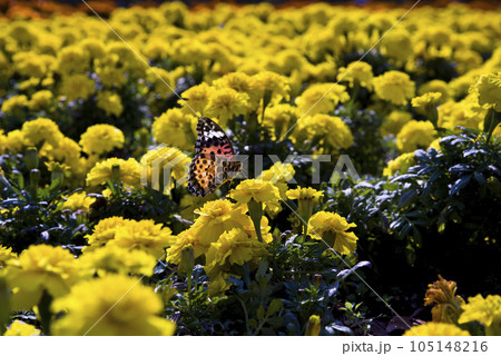 黄色いマリーゴールドの花にオレンジ色の蝶のツマグロヒョウモン(褄黒豹紋)がいます。