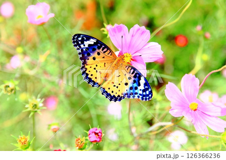 ツマグロヒョウモンとコスモスの花