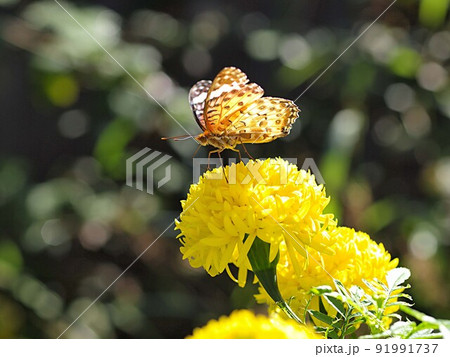 マリーゴールドの蜜を吸うツマグロヒョウモンの雄