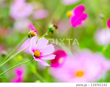 ピンクのコスモスに柔らかい光が降り注ぐクローズアップ