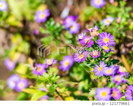 秋の花壇 紫色のかわいいノコンギクとツマグロヒョウモン蝶