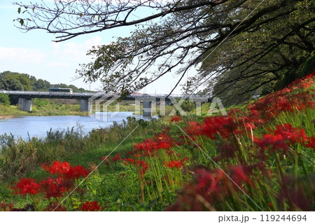入間川遊歩道のヒガンバナと西武池袋線2000系電車(埼玉県狭山市)