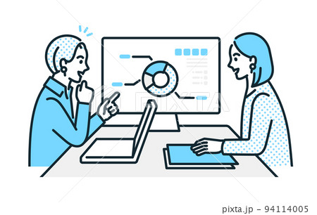 データを確認・分析しながら打ち合わせをするビジネスパーソン。働く女性のイラスト素材。