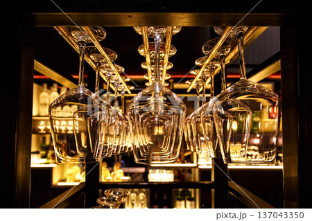 Hanging wine glasses in modern bar interior