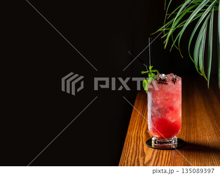 berry cocktail with ice and mint on a wooden table. copy space