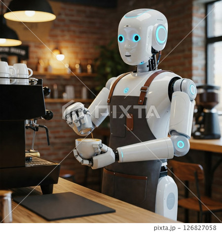 Robot barista prepares coffee in a cozy coffee shop.
