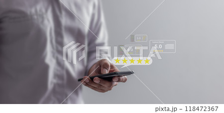 Consumer Satisfaction, Review, Young Man hand uses smartphone mobile with five star to review