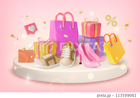 3d New Shoes Collection Concept Background Cartoon Design Style with Podium Scene with Paper Bag and High Heels. Vector illustration