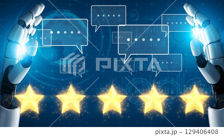 Customer Review, Man touch smile emoji to review and give 5 stars with very good results in service
