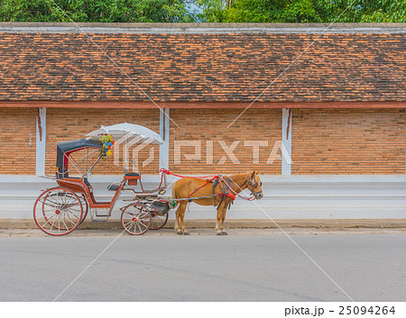 Horse drawn carriage tourists is driving along in front of the ancient temple of Bagan, Myanmar.